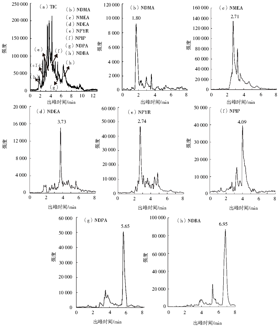 7種亞硝胺類物質(zhì)的剖析選用Waters(美國)出產(chǎn)的UPLC-TQD型超高效液相色譜質(zhì)譜聯(lián)用儀。色譜柱為 HALO 2 C18 (2.1 mm×100 mm,2 µm),挑選甲醇為有機相,10 mmol·L−1(pH為8.0左右)的碳酸氫銨為無機相,活動相流速為0.2 mL·min−1,進樣體積為10 µL,柱溫文樣品室溫度分別為40 ℃和25 ℃。選用梯度洗脫的辦法對所測物質(zhì)進行別離,活動相梯度改動為:0.2→3.00 min,5%→40%(甲醇);3.00→6.00,40%→60%(甲醇);6.00→8.50 min,60%→100%(甲醇);8.50→11.00 min,100%→5%(甲醇);5%的甲醇堅持2 min,總運轉(zhuǎn)時刻為13 min。運轉(zhuǎn)儀器進行測守時選用MRM(多通道監(jiān)測)形式,得到TIC(總離子流圖)和7種亞硝胺類物質(zhì)的色譜提取圖。