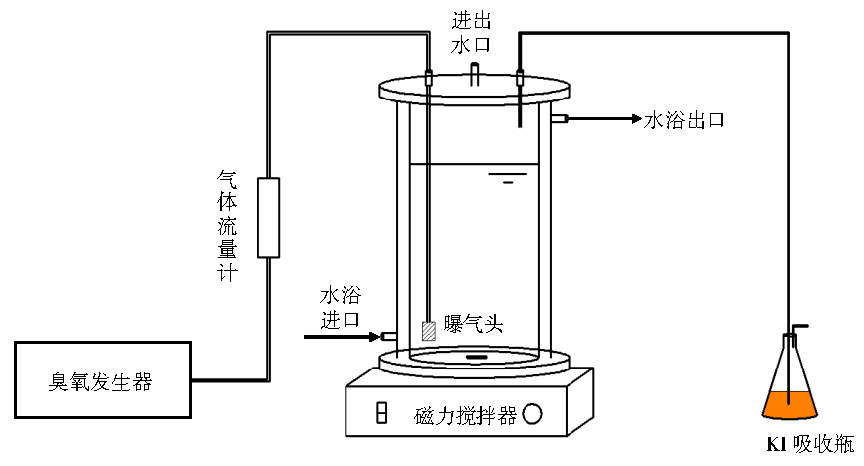 臭氧氧化試驗設(shè)備如圖1所示。該設(shè)備主體反響器有用體積為4.5 L,臭氧發(fā)生器(廣州佳環(huán)電器科技有限公司,HY-006-2CA)出口流量通過氣體流量計調(diào)理操控在60 L·h−1,未反響的氣體通入20% KI溶液進行吸收。整個反響設(shè)備通過水浴調(diào)理使得反響溫度操控在20 ℃,該臭氧氧化體系通過調(diào)理不同的反響時刻來操控臭氧投加量,整個反響進程在通風(fēng)櫥內(nèi)進行。