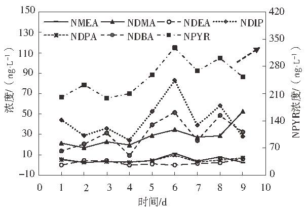 1)二級出水中檢測出7種亞硝胺類物質(zhì)(NPYR、NDIP、NDBA、NDMA、NDEA、NDPA和NMEA)的濃度由大到小依次為NPYR、NDIP、NDBA、NDMA、NMEA、NDPA和NDEA,均值分別為250、45.96、31.17、28、4.92、4.71和2.15 ng·L−1。